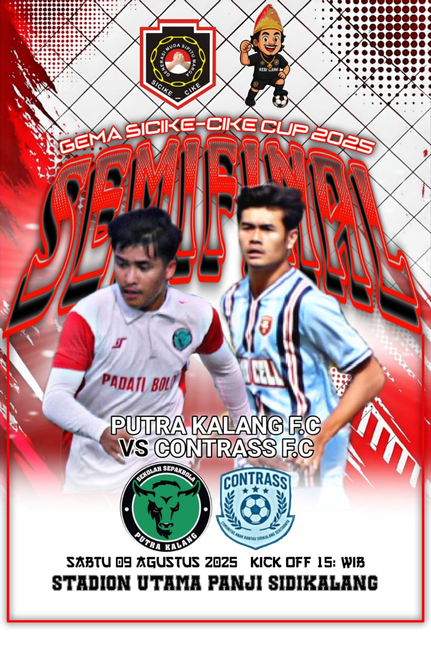 DAIRI-Hari ini, Sabtu, 9 Agustus 2025, jam 15.00 WIB, seluruh mata pecinta sepak bola di Sidikalang akan tertuju ke Stadion Panji. Bukan sembarang laga, tapi pertarungan maha penting antara Putra Kalang FC dan Contrass FC yang akan menentukan siapa yang berhak melangkah ke Grand Final Turnamen Sepak Bola Piala Bergilir Ketua DPP Gema Sicike-Cike tahun 2025!